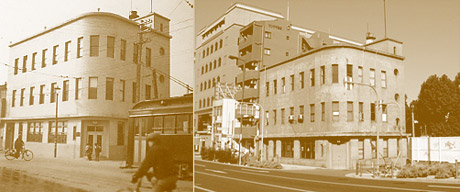 写真は左が竣工当時。写真手前には当時長堀川が電車道と平行して流れていた。右は現在(2004年10月17日撮影)のビル風景。左端の大きなビルは西区役所。手前の道は長堀川が埋め立てられた長堀通り。