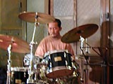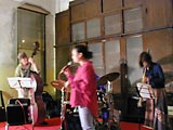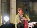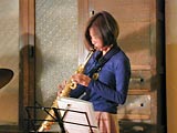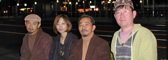 月の出ている少し寒い夜だった。今夜のプレイヤーは岩本ヒロユキ(ds)、中島教秀(b)、箕作元総(g)のトリオ Unit Ji-u-mu にゲストが東雲マリ(vo)と平田葉子(s-sax)。細野ビルヂングの1階ロビーをうめた満員のお客の中にジャズが響いた。パワフルで軽快ないつもの東雲マリのボーカル、最後の「A列車で行こう」は、千日前線に乗って〜と唄って客を湧かせる。ベテラン4人の中で健闘する若い平田葉子のソプラノサックスはリリシズム溢れる美しい音色で、レトロなビルに吸い込まれていく感じがとてもいい。ぼくはもうすっかり忘れていた1980年頃の京都のジャズ喫茶で聞いたスティーブ・レイシーのソロライブを思い出してしまった。あんな感じの音をいつか聞かせてほしいと思った。写真左上は細野ビルの前、長堀通りをバックに休憩時間の、箕作、平田、岩本、中島(左から)。/文&写真=杉谷 |