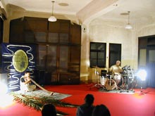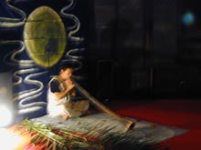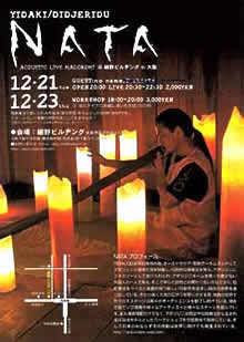 前半はYIDAKI/DIDJERIDU奏者のNATAのソロ演奏、後半はゲストの no name(近田和久-ds)との二人の演奏だった。前半のソロは1ヵ月前のここでの演奏よりも、神秘性が強く出ていて瞑想度が増していた。後半に参加した近田のドラムはNATAの民族楽器に触発されるように、軽快感を持ちつつもどこかアフリカを連想させる響きだった。といって民族音楽というわけではない。ジャズとかロックでもなくて、そんなことはどうでもいいという小気味良さが心地よかった。(2004.12.22写真と文 sugiya) |