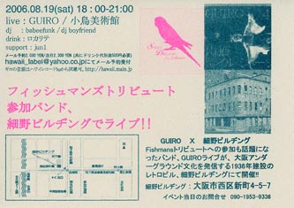 2006.08.19(sat) at 細野ビルヂング LIVE : GUIRO/小鳥美術館 DJ : dj boyfriend / babeefunk DRINK,FOOD : ロカリテ くわしくは http://hawaii.main.jp/news/guiro_ho.htm