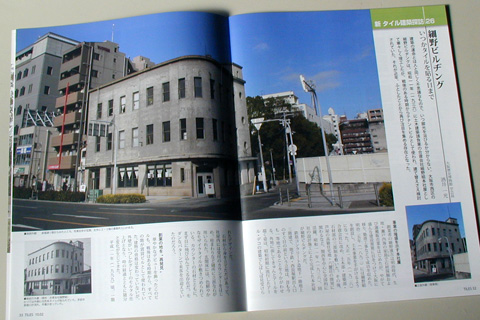 タイル業界が出版している月刊誌のようだ。本号にも、古い建築物のタイルや新しい住宅のタイルが美しい写真で紹介されている。その中で、細野ビルヂングは「新 タイル建築探訪26」というコーナーで紹介されている(P32-35)。